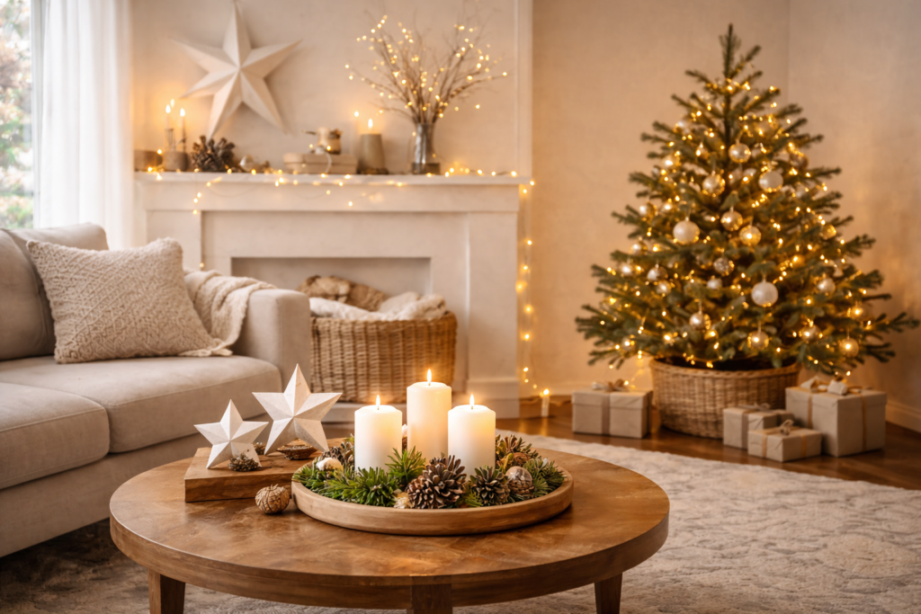 Pale woods, paper stars, neutral textiles and soft candlelight are characteristic of a Scandinavian festive look. Your home feels calm, intentional and quietly cosy, with decorations that prioritise atmosphere over excess.