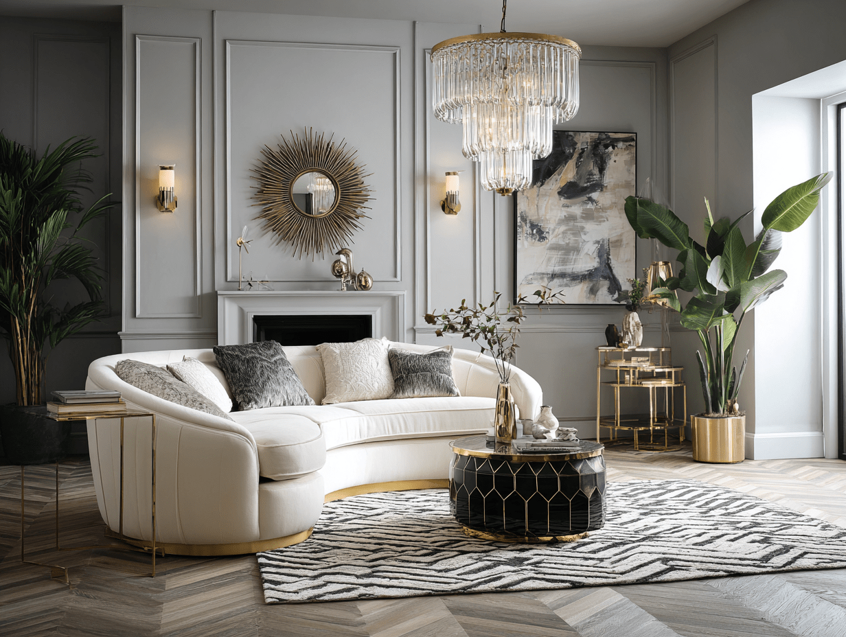 - Luxury. Think real, and think glamourous. Glass, chrome, marble, velvet, polished wood and metal all combine to create an air of luxury. The end result shouldn’t be overstated or loud, but should give a quiet impression of sleek solidity.